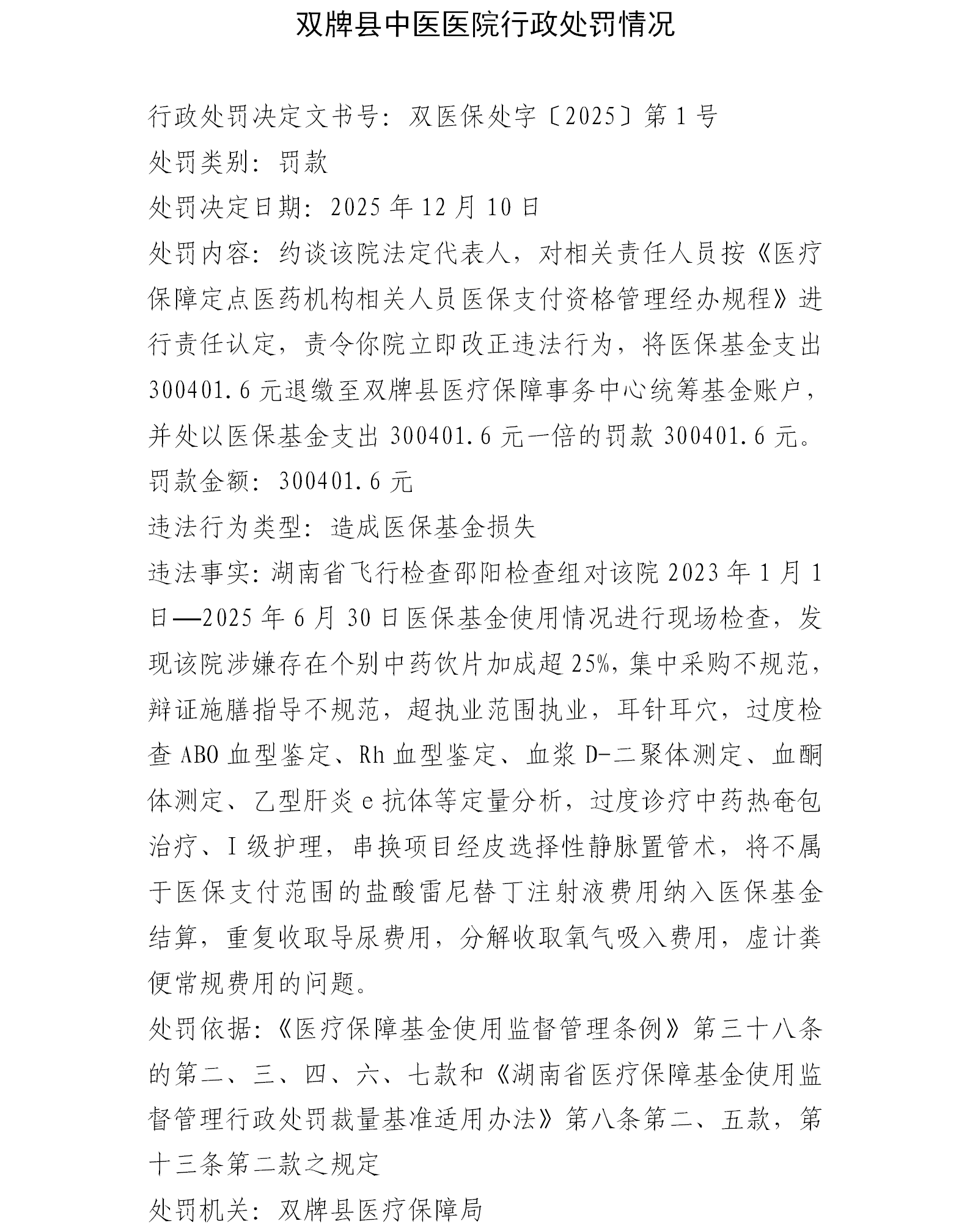 双牌县中医医院行政处罚情况公示