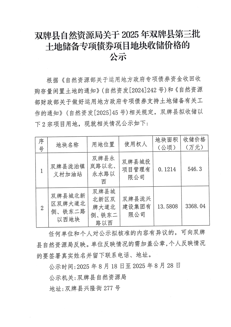 双牌县自然资源局关于2025年双牌县第三批土地储备专项债券项目地块收储价格的公示