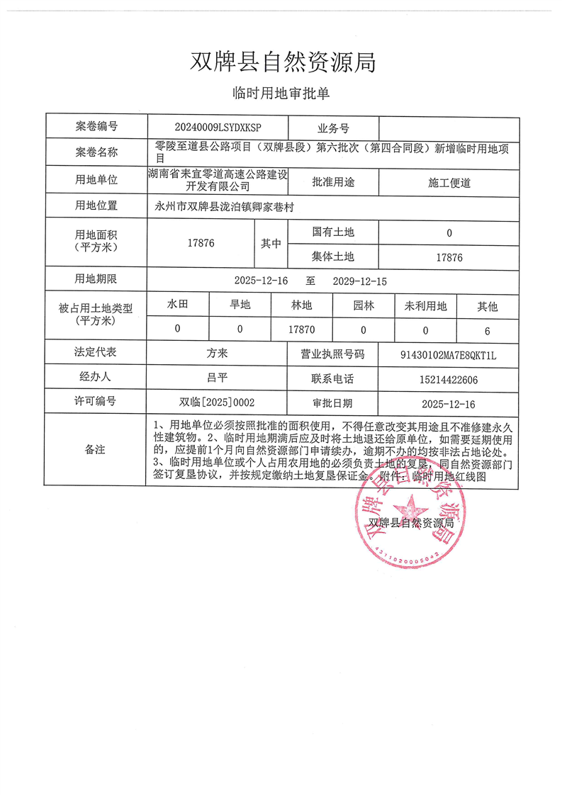 零陵至道县公路项目(双牌县段)第六批次(第四合同段)新增临时用地