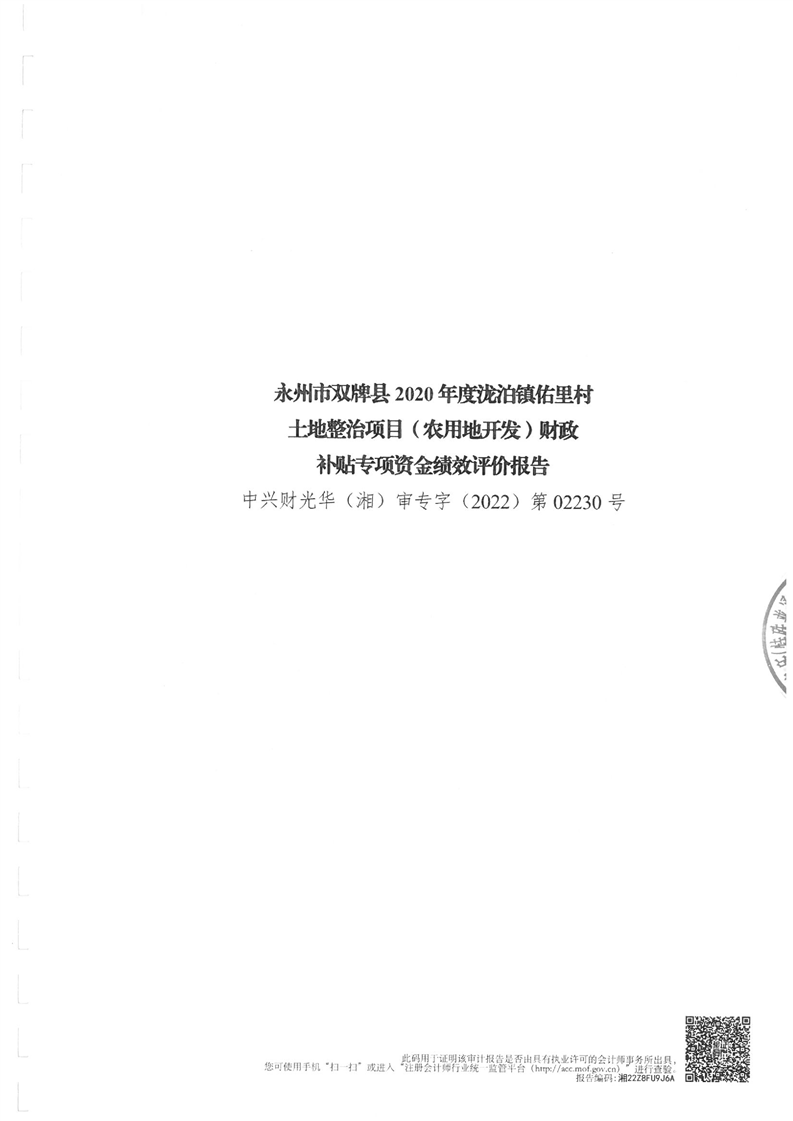 2020年双牌县泷泊镇佑里村引进社会资本投资补充耕地开发项目绩效评价报告