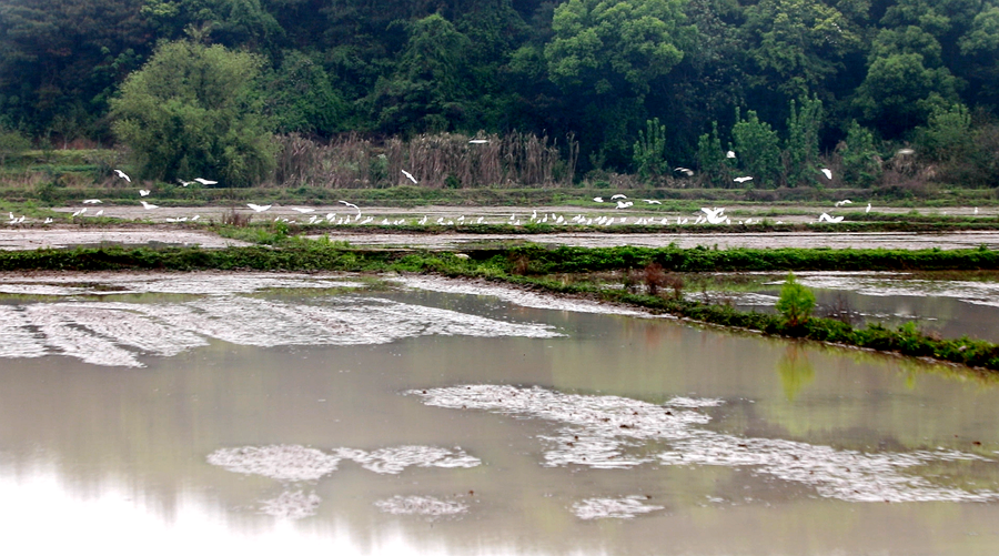 据了解,每年三月当地大田翻耕之际,便会吸引成群白鹭前来栖息觅食。肥沃的土壤富含有机质,为白鹭提供了充足的昆虫、泥鳅等天然饵料。它们或在田间觅食休憩,或梳理羽翼,或结伴翱翔,尽情徜徉在这片生态沃土之上。