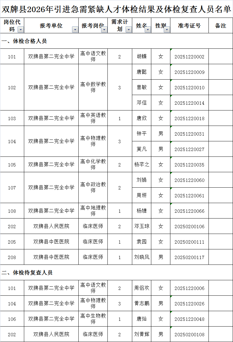 1.双牌县2026年人才引进体检结果及体检复查人员名单