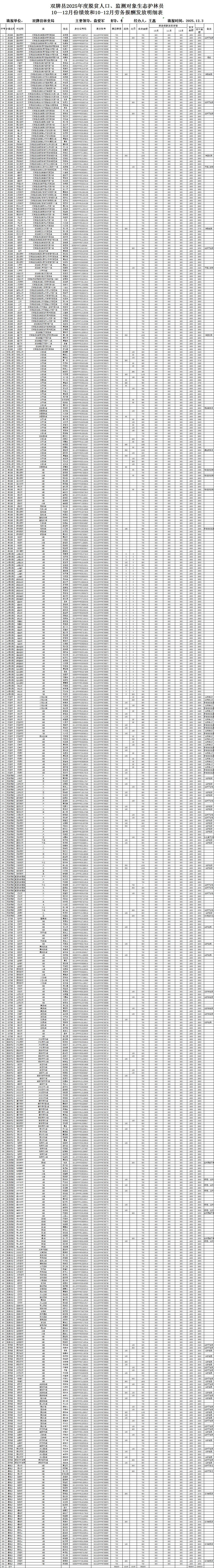 双牌县2025年度脱贫人口、监测对象生态护林员10—12月份绩效和10-12月劳务报酬发放明细表