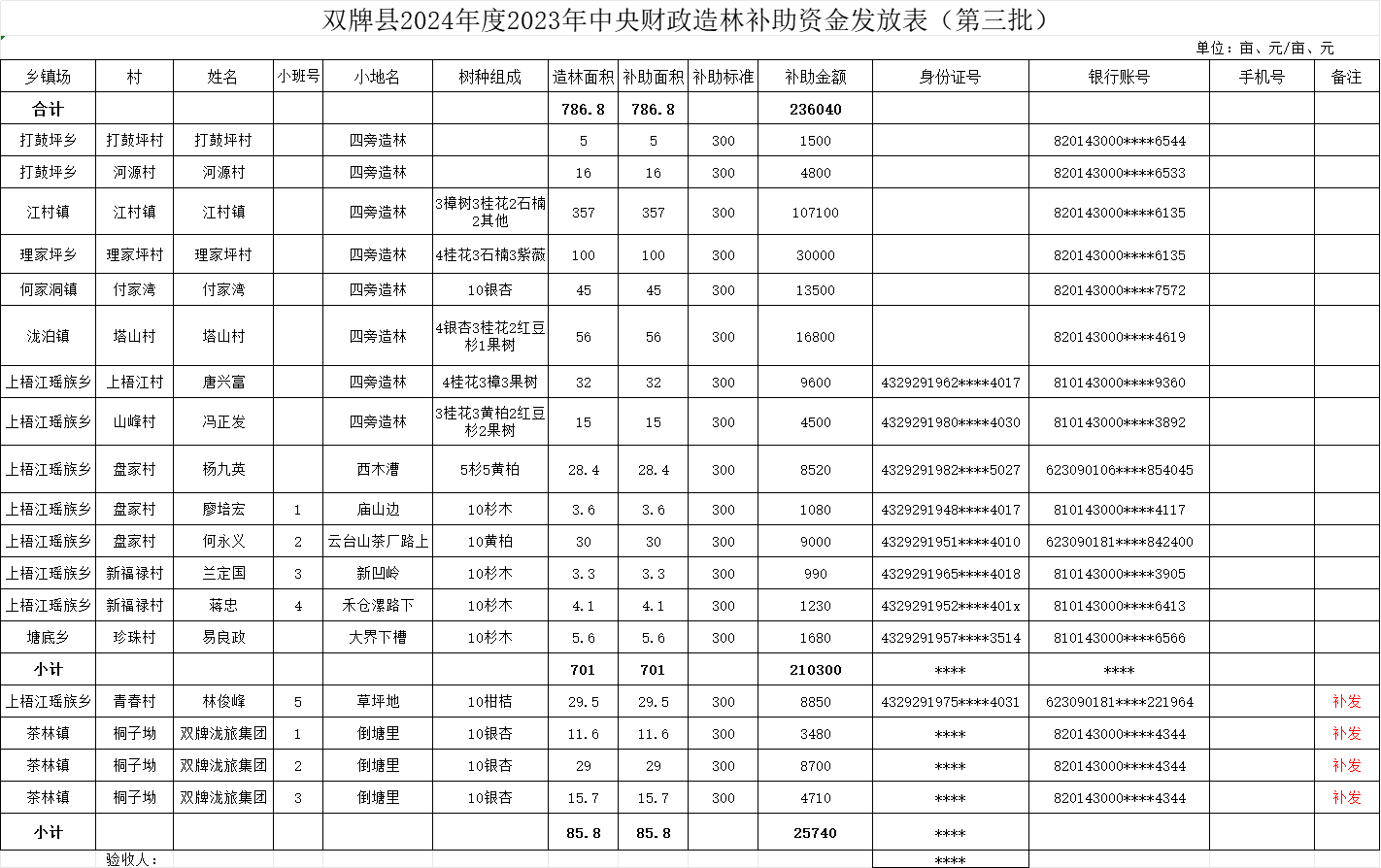 双牌县2024年度2023年中央财政造林补助资金发放表(第三批)