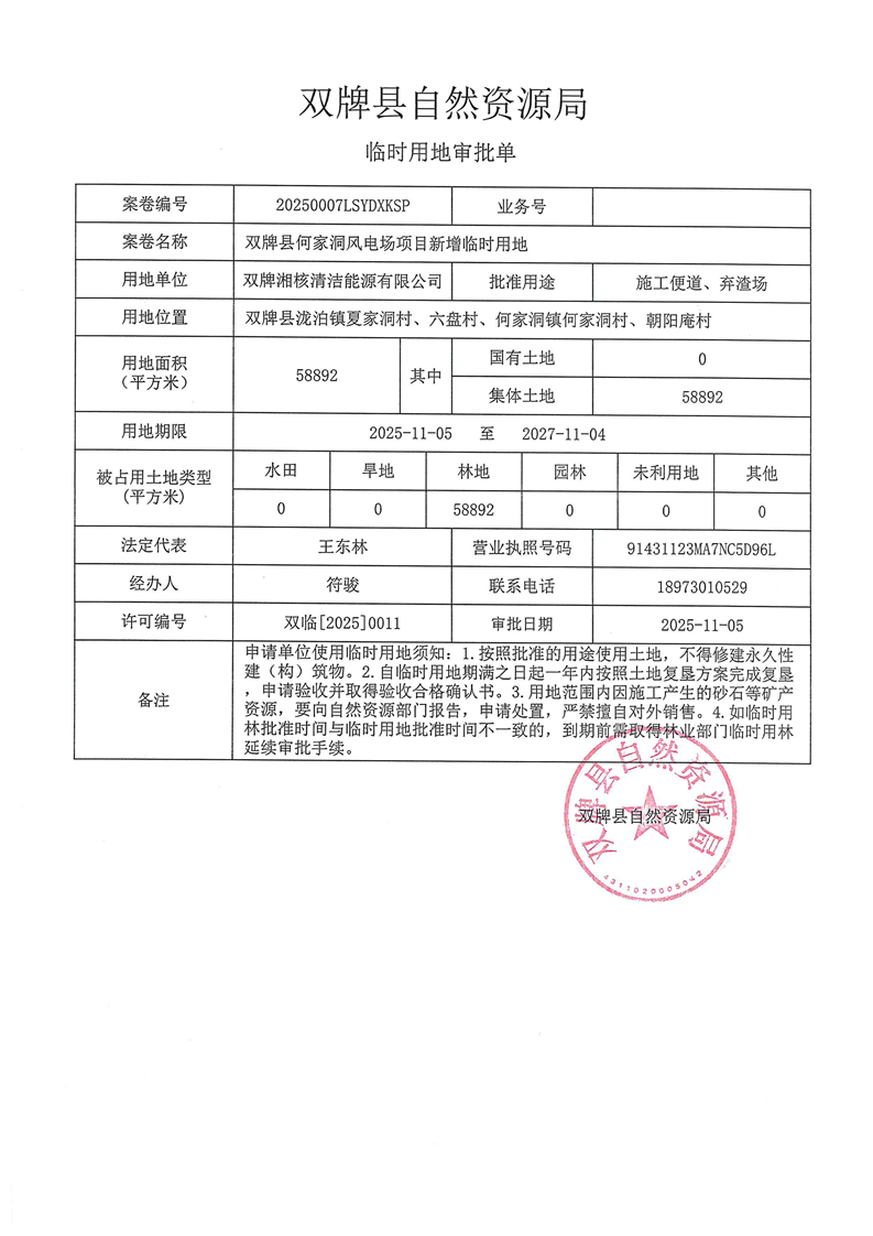 双牌县何家洞风电场项目新增临时用地临时用地审批单