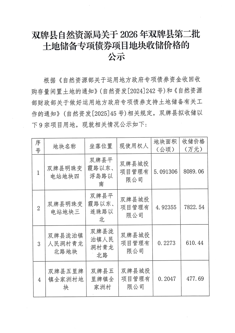 双牌县自然资源局关于2026年双牌县第二批土地储备专项债券项目地块收储价格的公示